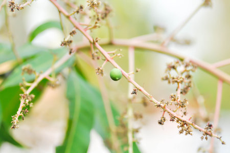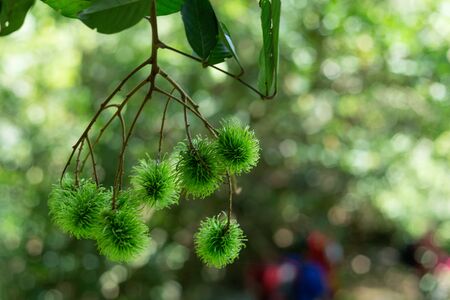 Lychee flowers are growing as a young fruit on the tree in the garden on a blurry natural background.
