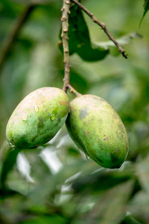 closeup the ripe green mango fruit with branch with leaves hold hand over out of focus green brown background.