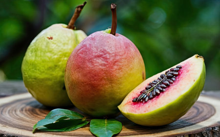 Guava, exotic fruits, flat lay overhead top view, AI generative