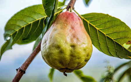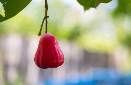 Rose Apple hanging on the tree in the garden on a blurred nature background.