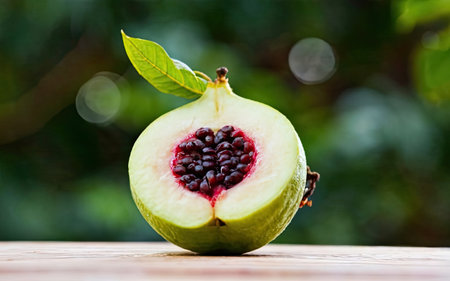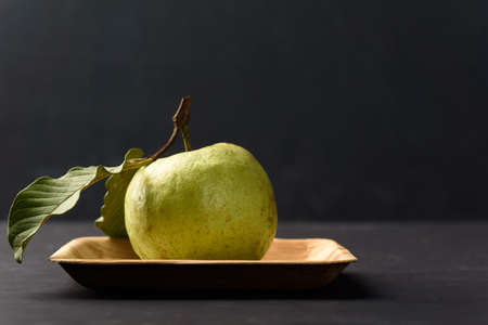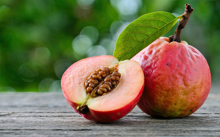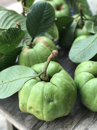 Fresh guava fruit on wooden table with green nature background. Guava is one of the most popular fruit in Thailand.