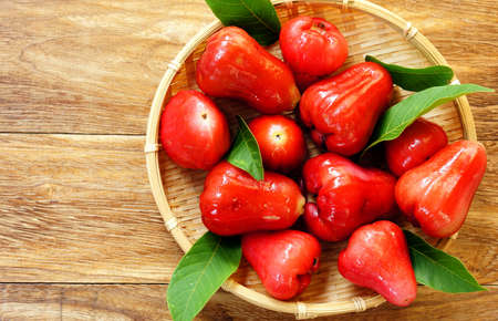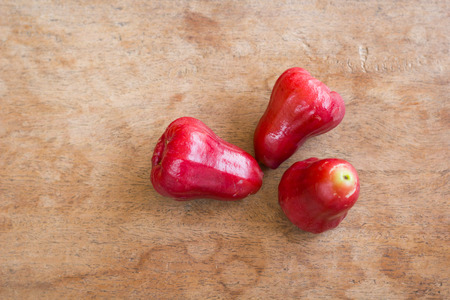 Local Indonesian fruits names Jambu Air or Red Water Guava ,placed on brown wooden background