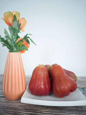 Rose apple , also known as jambu air, wax apple and chomphu on white plate and a vase of fake flower. Selective focus points.