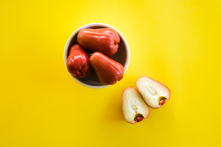 Syzygium Aqueum , Bell fruit or Jambu Air in local Malay language, is a fruit that has a shape like a bell; shot on isolated yellow background.