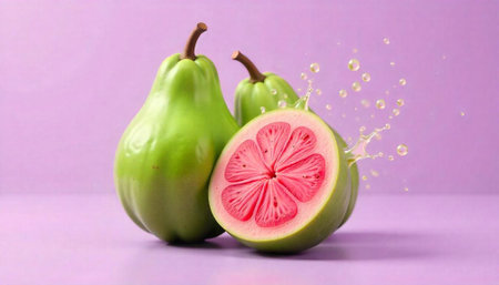 Close up of a slice of rose apple , also known as jambu air, wax apple and chomphu with whole fruit on blurred background Selective focus points.