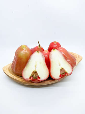 fresh premiun quality rose apple or Syzygium samarangense with wooden bowl isolated on white background. Also known as wax apple, Java apple, Semarang rose-apple, wax jambu and jambu citra.