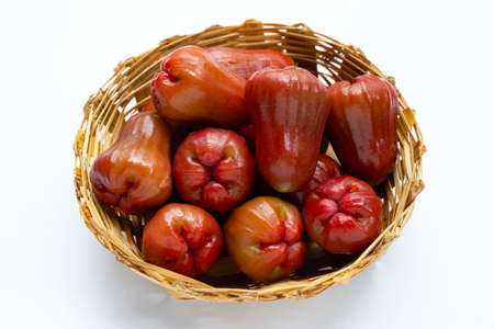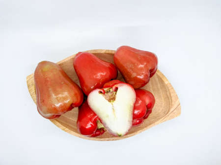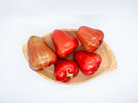 fresh premiun quality rose apple or Syzygium samarangense with wooden bowl isolated on white background. Also known as wax apple, Java apple, Semarang rose-apple, wax jambu and jambu citra.