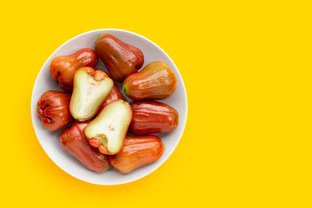 Syzygium Aqueum , Bell fruit or Jambu Air in local Malay language, is a fruit that has a shape like a bell; shot on isolated yellow background.