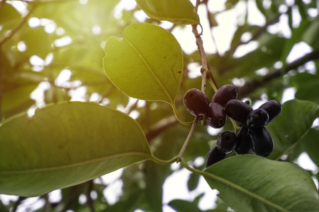 A bunch of organic blood red and black Java plum Jambolan fruits (Syzygium cumini) on its tree in Africa. Healthy exotic vegetarian and travel concept