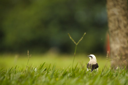 A closeup shot of a cute small bird standing on the grassy ground with blurred background