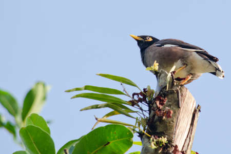 A young parrot is perching on a tree branch. Birds that are good at imitating human voices have the scientific name Gracula religiosa.
