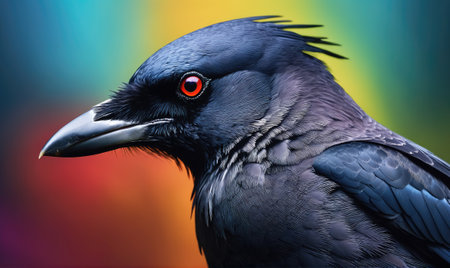 A dark bird with bright orange eyes and beak perches on a tree branch laden with ripe, round oranges. The image features a shallow depth of field, with green leaves and a blurred background. The natural sunlight suggests an outdoor environment, suitable for various editorial and commercial applications.