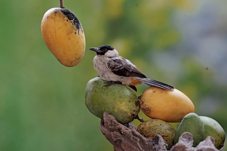 White-vented Bulbul, Pycnonotus goiavier, single bird on fruit, Brazil