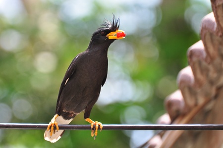 The Common Myna (Indian Myna) or Acridotheres Tristis standing with the opened mouth on the edge of wood