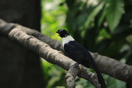 A photo of a stone magpie (Copsychus malabaricus) is sunbathing and perched on a twig in a cage