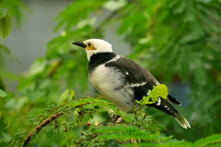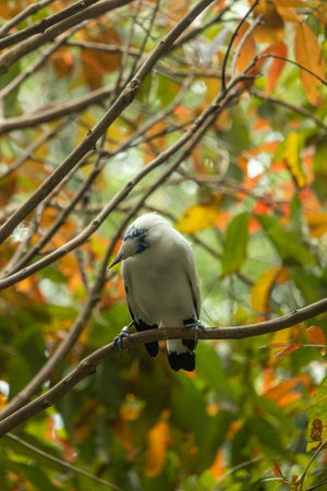 Beautiful Balinese myna bird or balinese starling perched on a tree branch