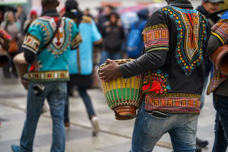 MOSCOW, RUSSIA, 14 OCTOBER 2017: Carnival parade in Moscow dedicated to the 19th World Youth Day and students. African musicians play drums
