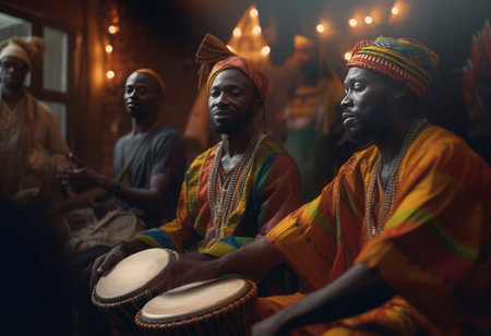 African musical performers play inside. Casual carnival culture group band. Generate Ai