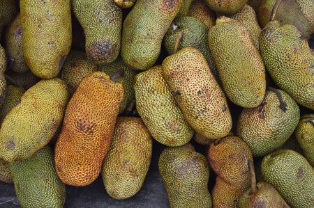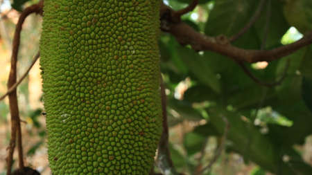 Asian summer fruits named Jackfruit scientific name Artocarpus heterophyllus, Jackfruit hanging on jackfruit tree.