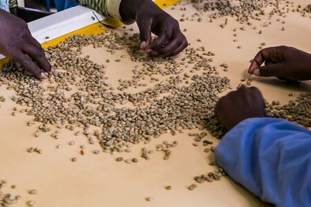 Close up of workers hands picking beans off a production line in a coffee bean factory