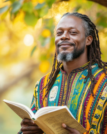 A passionate poet recites heartfelt verses under a majestic tree, as golden hour light illuminates their expressive face and fluttering pages in hand.