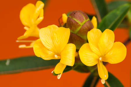 Macro of beautiful romantic forest dreamy magic yellow flower with green leaves background. Toned with filters in retro vintage color. Soft selective focus and blurry floral nature background.