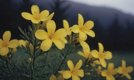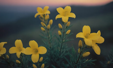 A stunning view of vibrant yellow flowers blooming in a serene meadow, bathed in soft natural light. This photo captures the essence of spring and tranquility.