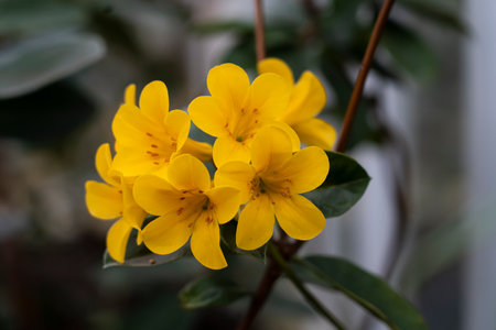 Beautiful fairy dreamy magic yellow flowers with dark green leaves in flowerbed, toned with filters in retro vintage style effect, soft selective focus, blurry background, copyspace for text