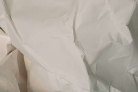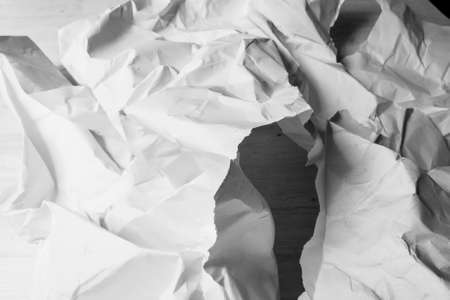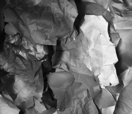 Close-up view of crumpled paper sheets featuring torn edges and faded text, creating a chaotic yet artistic composition with varying shades and textures.