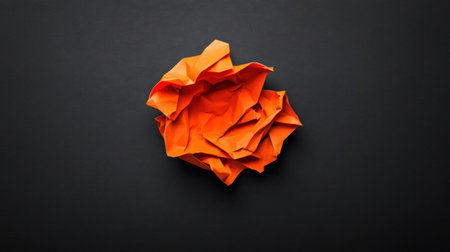 Close-up of a vibrant orange crumpled paper ball against a contrasting black backdrop.