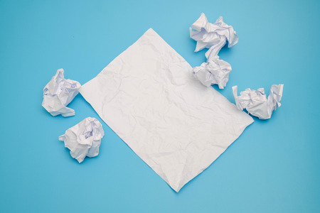 Coffee cup with white crumpled paper balls on a blue background. Top view