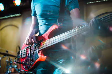 The musician plays the electric bass guitar on stage. Guitar neck close-up on a concert of rock music in the hands of a musician. Fingers on fretboard. Guitar neck close-up on a concert of rock music in the hands of a musician. Fingers on fretboard