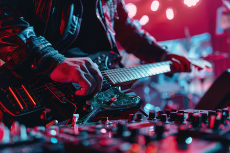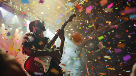A rockstar guitarist ignites the stage with electrifying energy, bathed in vibrant lights His passionate performance captivates the crowd, as his powerful riffs and stage presence deliver a thrilling live music experience AI Generative