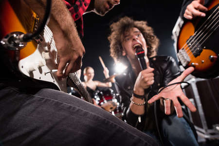 KYIV, UKRAINE - AUGUST 25, 2020: Low angle view of vocalist shouting in microphone near guitarists with backlit on blurred background
