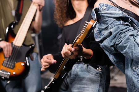 KYIV, UKRAINE - AUGUST 25, 2020: Cropped view of rock band musician with blurred guitarists on background