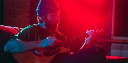 Young handsome creative man with a guitar in the darkness of a music studio, toned background