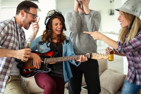 Close up hands playing. Musician band jamming together in art workplace with instruments. Caucasian men and women, musicians, playing and singing together. Concept of music, hobby, emotions, art occupation.