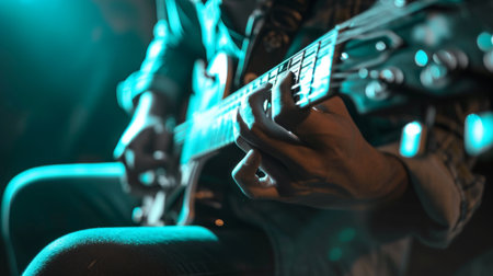 The guitarist plays the guitar in the spotlight. Hands of a Guitar player playing the guitar. Selective focus. Soft focus