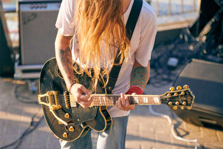 Svetlogorsk, Russia - 08.15.2021 - Rock musician playing guitar at outdoor rock party. Long haired guitarist playing grunge music at open air rock concert. hard rock metal group performance