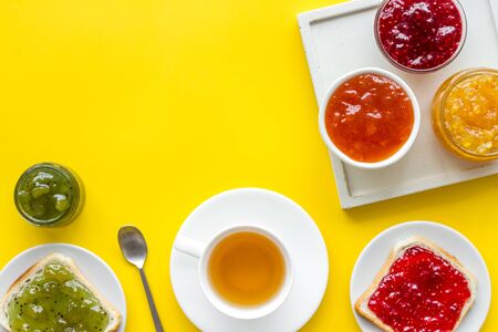 Tea party with jam. Toast, teapot, cup on yellow background frame copy space