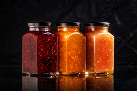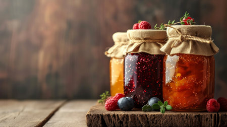 Home Preserves. A trio of jars filled with a delightful array of homemade jams: strawberry, apricot, blackcurrant, raspberry, peach, or cherry. Sweet, flavorful, and nutritious organic desserts. With ample copy space