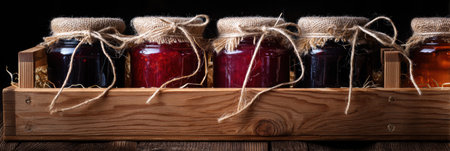 Close-up of wooden crate with homemade berry jam, jelly, confiture and marmalade confiture in glass jars standing upside down against a wooden rustic background. Canning concept