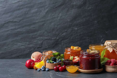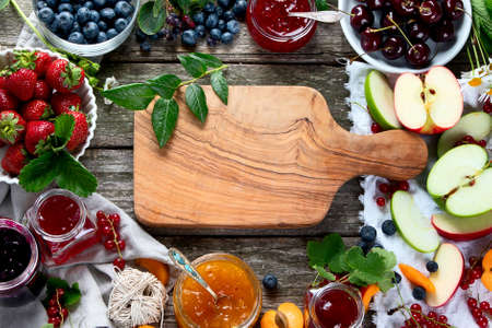 Food and drink, harvest summer autumn concept. Assortment of seasonal berries and fruits jams in jars on a wooden table. Copy space rustic background