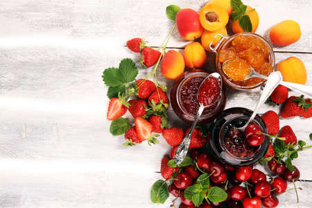 assortment of jams, seasonal berries, apricot, mint and fruits. marmalade or confiture