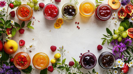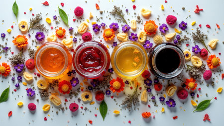 Colorful jars of jam surrounded by vibrant edible flowers and herbs. That the image is generated using AI.