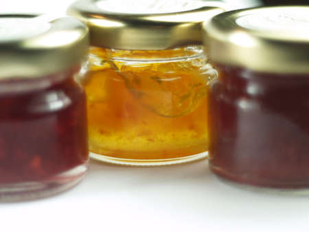 Set of colorful glass jars with iron lids and jam of different flavor, orange, red, black color on marble surface and white background. High quality photo