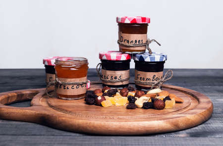 Small glass jars with lids with fruit or berry jam tied Shapagat on the table, round cutting board, candied fruit, nuts - hazelnut, cashew, almond