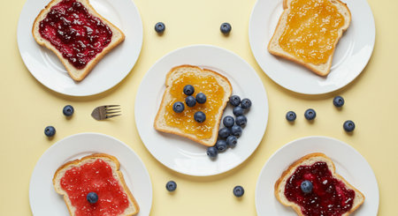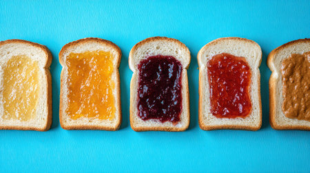 Colorful Arrangement of Slices of Bread with Various Jams and Spreads on a Bright Blue Background