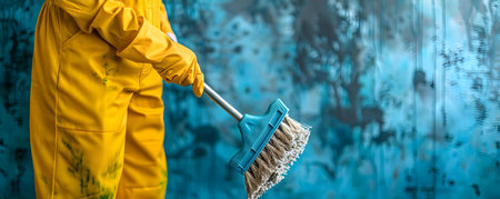 Professional Cleaning Crew: Several individuals with mops and vacuums clean a spacious area, illustrating the concept of thorough cleaning, Banner, place for text