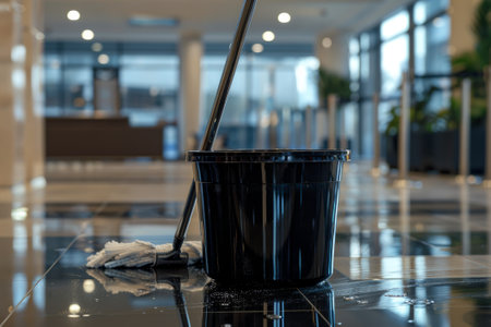 A bucket with a mop on the floor in an empty office. Cleaning concept
